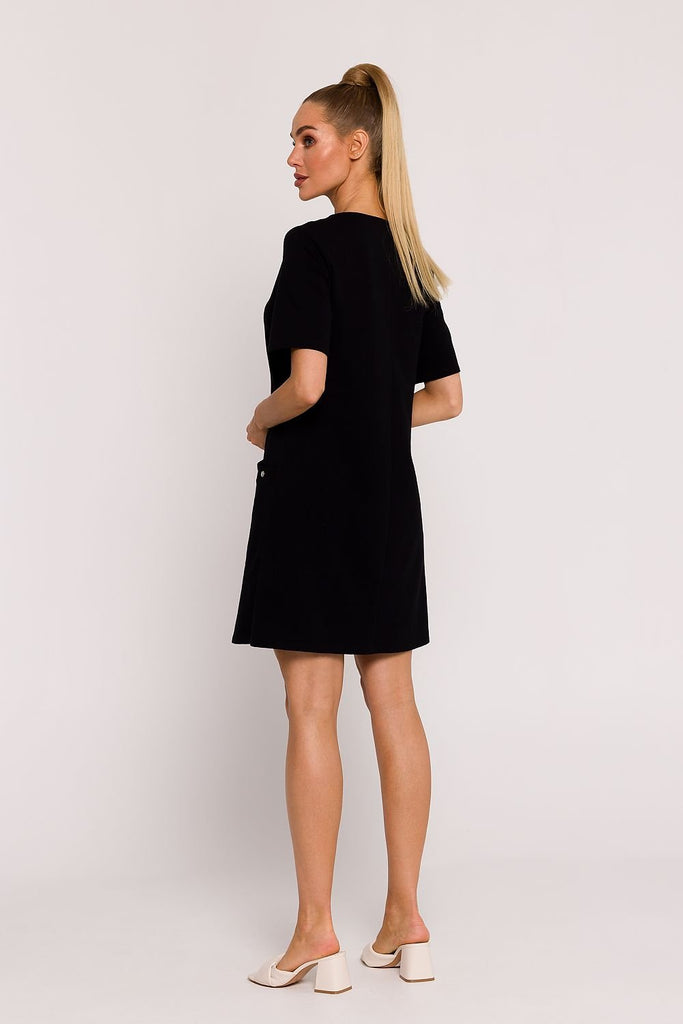 Elegant black dress made of a nice-to-touch fabric with pleats at the neckline. The dress is unlined and fastened with a covered zipper. The dress perfectly emphasizes the qualities of a woman's figure. An excellent and comfortable choice for everyday office wear. Spandex 2.1 % Polyester 74.8 % Viscose 23.1 % Size Lenght Hips Chest Waist 34 102 cm 90...