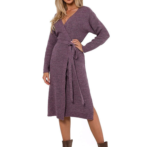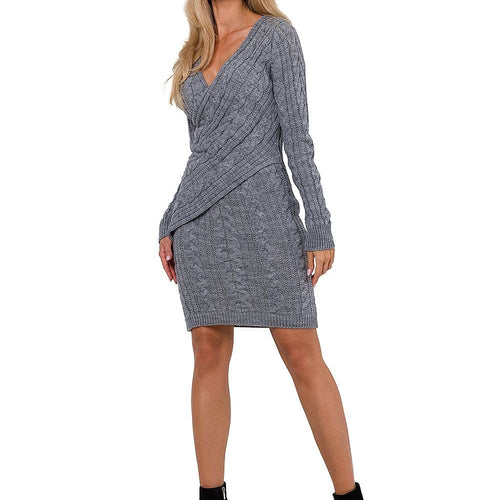 Sweater dress in plain weave yarn, with long sleeves. Dress with envelope front, tie at waist. Designed and sewn in Poland.. Material composition: 60% polyacrylonitrile, 20% wool, 20% polyester. Size Lenght Hips Chest one-size-fits-all 111 cm 92 cm 90 cm