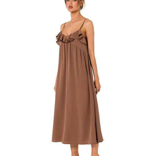 Loose cut midi dress with thin straps and decorative ruffle at the neckline. The dress has a flared cut, fastens with a covered zipper, and is unlined. Spandex 5 % Polyester 95 % Size Total length Chest L 116 cm 92 cm M 115 cm 87 cm S 113 cm 82 cm XL 117 cm 97 cm XXL 118 cm...