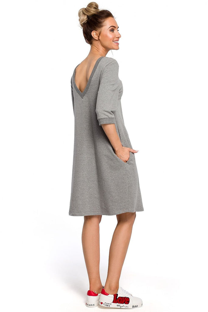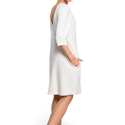 A loose cut that does not restrict movement, and at the same time feminine details and a deeply cut neckline on the back make it a perfect everyday dress in which you will feel feminine and free regardless of the chosen accessories. Dress with side seam pockets and 3/4 sleeves. Cotton 90 % Spandex 10 % Size Lenght Hips Chest...