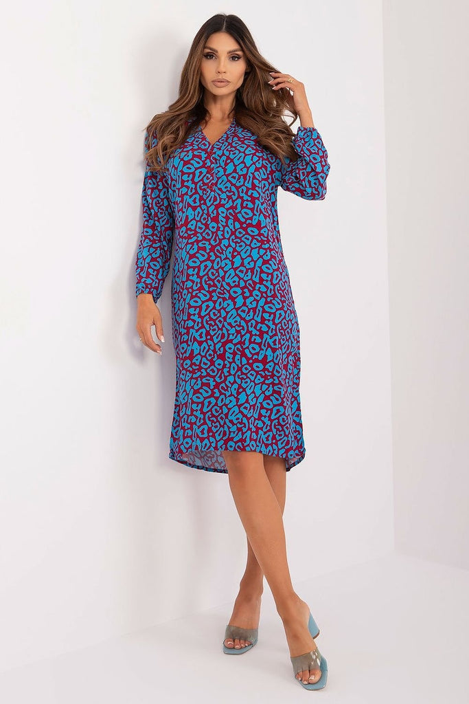 Dress with long sleeves, collar and V neckline. Dress cut off at the waist, decorative buttons on the front. Unlined dress, fastened with a covered zipper. Decorative pleating at the bottom. Designed and sewn in Poland. Spandex 5 % Polyester 65 % Viscose 30 % Size Lenght Hips Chest Waist L 97 cm 104 cm 98 cm 84 cm M...