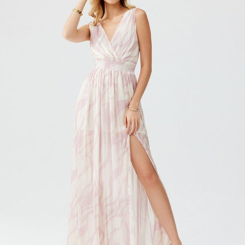 The dress is made of a pleasant, airy chiffon fabric. It has a lining that prevents the material from showing through. The maxi length gives it elegance and elongates the silhouette. The overlap neckline perfectly elongates the neck, and the delicate cutout on the back subtly reveals the back. The dress fits perfectly around the waist, emphasizing the feminine silhouette,...