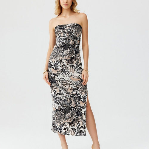 Zuri dress is a fitted dress cut that comfortably clings to the figure. The elastic patterned fabric does not restrict movement, and the slit on the leg provides freedom. The 7/8 length adds elegance and class to the dress. The strapless neckline has a sewn-in elastic band to prevent the dress from slipping. On the bust there is a subtle...