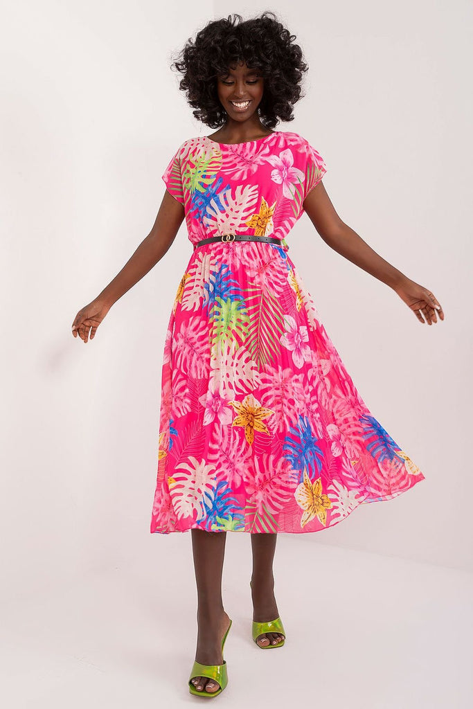 Pleated summer dress for many occasions, with short ruffle sleeves. The dress has a lining, an elastic waistband and a sweetheart neckline. The dress, with a flared cut, is complemented by a waist belt in addition to frills. Spandex 5 % Polyester 95 % Size Total length Chest one-size-fits-all 106 cm 98 cm