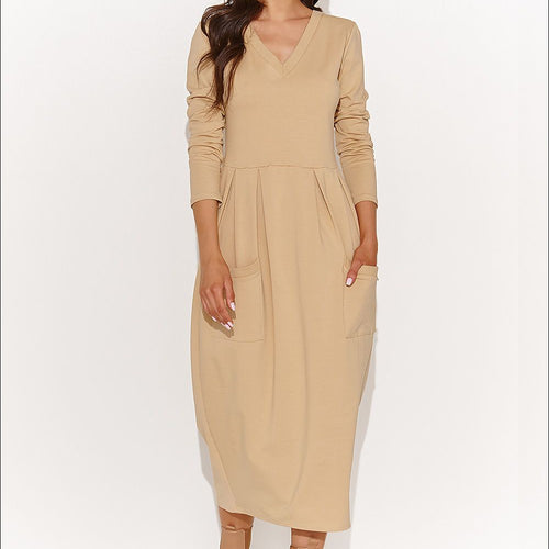 A knee-length dress, sewn from sweatshirt knit fabric available in khaki, sand and black. The dress features long sleeves, a v-neck and pockets. It adds to its casual style. In addition, the lower part of the dress is very casual. The dress is sewn into the dress with a decorative plate. The advantage of this dress is undoubtedly its loose...