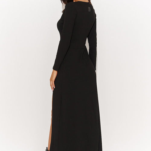 This tight women's dress will add glamour and confidence to your look. The top is sewn from a comfortable and casual knit fabric, providing maximum comfort while adding elegance. The dress has long sleeves and is zippered at the back. The lower part, sewn from eco-leather, subtly hugs the hips, and the asymmetrical slit gives the whole a remarkable charm...