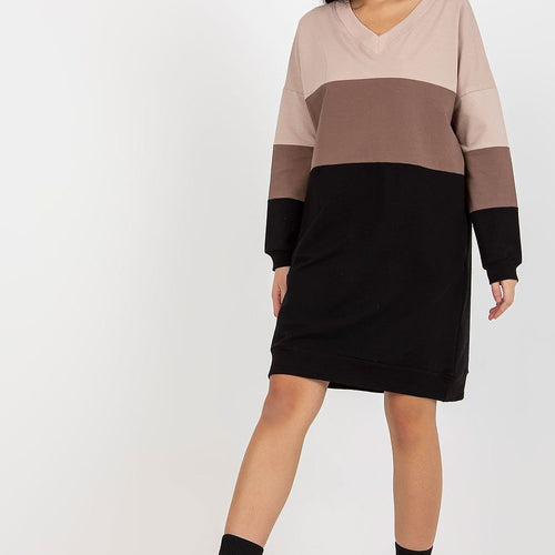 A tracksuit dress with long sleeves and a heart neckline. The dress is made of fabric in three colors. Slip pockets on the sides. A perfect choice for everyday wear. Cotton 90 % Spandex 10 % Size Chest Waist L/XL 91-96 cm 84-96 cm S/M 82-86 cm 72-86 cm