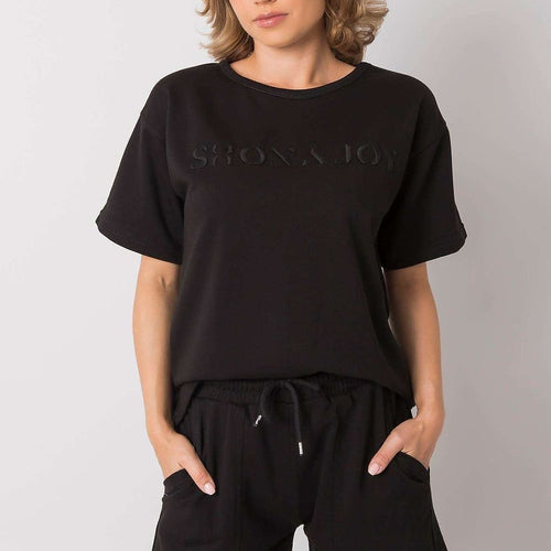 Tracksuit set consisting of a blouse and shorts. Blouse with short sleeves, round neckline, inscription on the front. Shorts with high waist, slip pockets on the sides. Shorts with elastic waistband, tie trousers. Cotton 70 % Polyester 30 % Size Lenght Chest Waist one-size-fits-all 52/38 cm 96 cm 68 cm