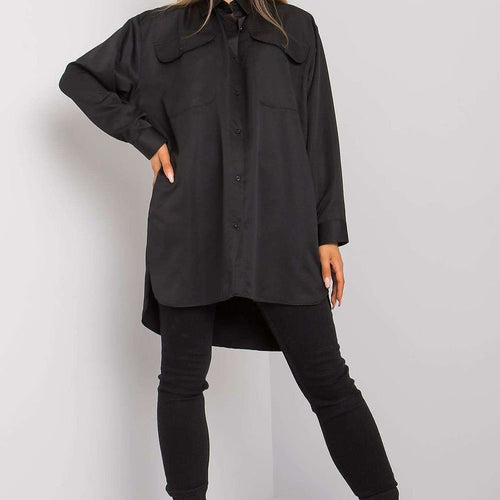 Black cotton women's shirt with an extended cut. The shirt is buttoned. On the front pockets. Ideal for many occasions. Cotton 70 % Polyester 30 % Size Total length Chest one-size-fits-all 90 cm 124 cm