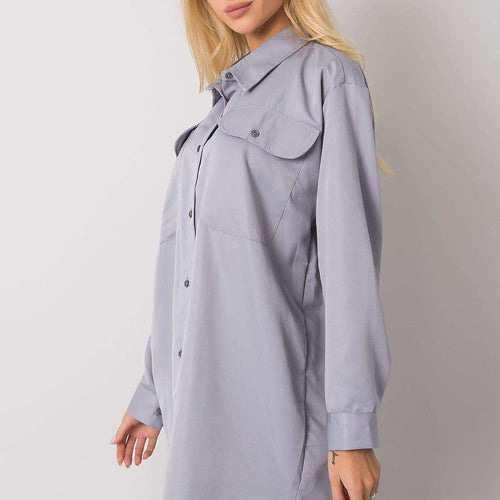 Grey cotton women's shirt with an extended cut. The shirt is buttoned. On the front pockets. Ideal for many occasions. Cotton 70 % Polyester 30 % Size Total length Chest one-size-fits-all 90 cm 124 cm
