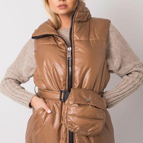 Brown down vest with lining, zipped. Vest with pockets, belt included. Polyester 100 % Size Chest L/XL 91-96 cm S/M 82-86 cm