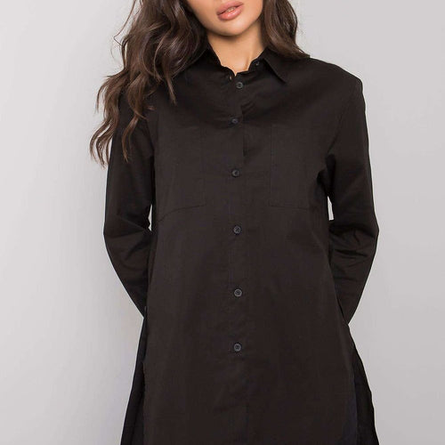 Black cotton shirt with an extended cut and long sleeves. The shirt is buttoned. Cotton 97 % Spandex 3 % Size Total length Chest one-size-fits-all 87 cm 116 cm