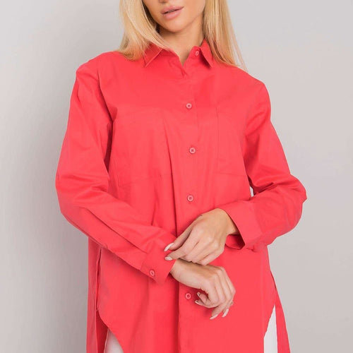Coral cotton shirt with a longer cut and long sleeves. The shirt is buttoned. Cotton 97 % Spandex 3 % Size Total length Chest one-size-fits-all 87 cm 116 cm