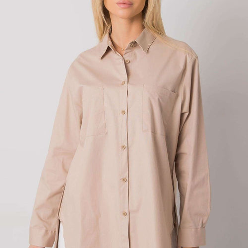Beige cotton shirt with an extended cut and long sleeves. The shirt is buttoned. Cotton 97 % Spandex 3 % Size Total length Chest one-size-fits-all 87 cm 116 cm