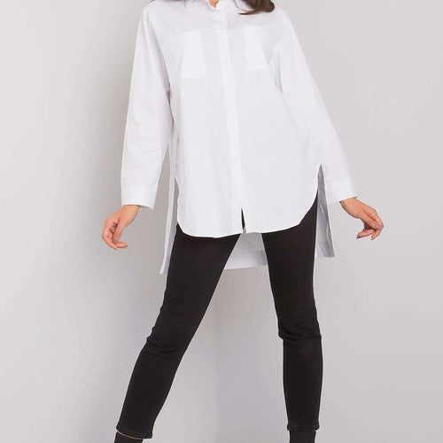White cotton shirt with an extended cut and long sleeves. The shirt is buttoned. Cotton 97 % Spandex 3 % Size Total length Chest one-size-fits-all 87 cm 116 cm