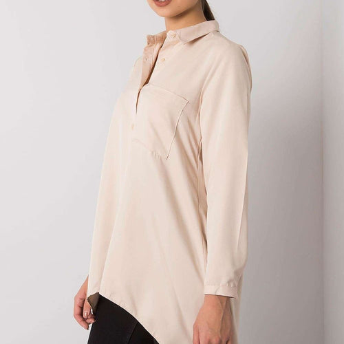 Beige shirt with longer back, buttoned. Perfect for many occasions. Cotton 72 % Spandex 6 % Polyester 22 % Size Total length Chest one-size-fits-all 68/90 cm 102 cm