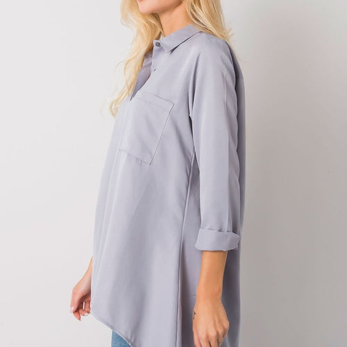 Grey button down shirt with longer back. Perfect for many occasions. Cotton 72 % Spandex 6 % Polyester 22 % Size Total length Chest one-size-fits-all 68/90 cm 102 cm