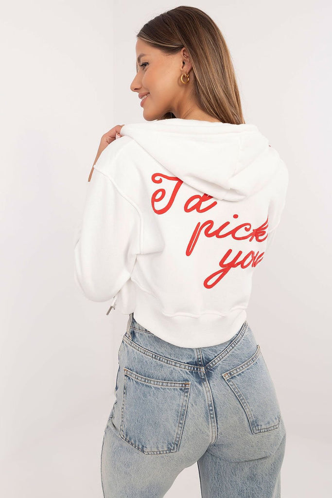 Stylish short sweatshirt for women in casual style is the perfect solution for colder days. Made from a blend of cotton and polyester, it provides comfortable wear and durability. The insulation inside makes the sweatshirt perfect for the autumn-winter season. The sweatshirt has long sleeves and a practical hood, which adds to its functionality. It is distinguished by a dominant...