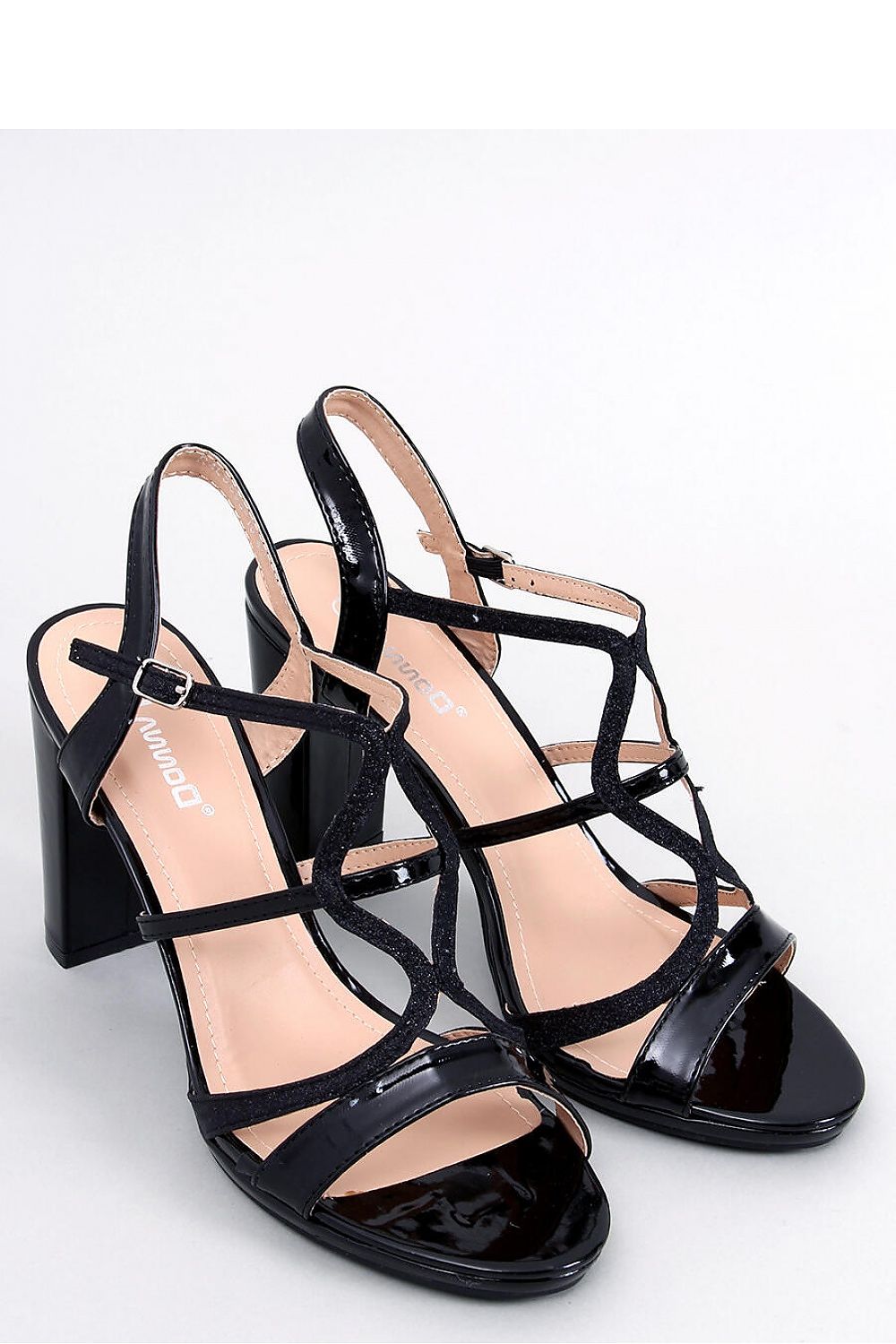 Women's sandals on a post with a height of 10 cm. Lacquered finish and glitter stripes will attract the eyes.... These are shoes with character! Adjustable clasp wrapping around the ankle beautifully emphasizes it, and the straight heel slims the silhouette. Do not wait and order them today : ) Outer material ? ecological leather lacquered.
