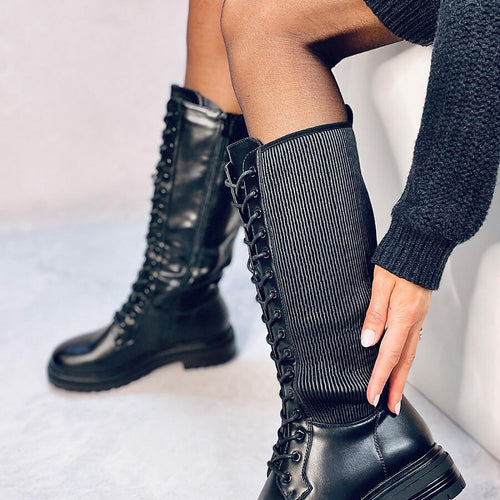 Women's veneer boots - lace-up jackboots. The elastic upper ensures a perfect fit, and the zipper closure makes it easy to put on. These boots will surely meet your expectations! Do not wait and order them now : ) The interior of the shoes is lined with soft fur. Outer material - ecological leather + fabric. fabric leatherette + fabric...