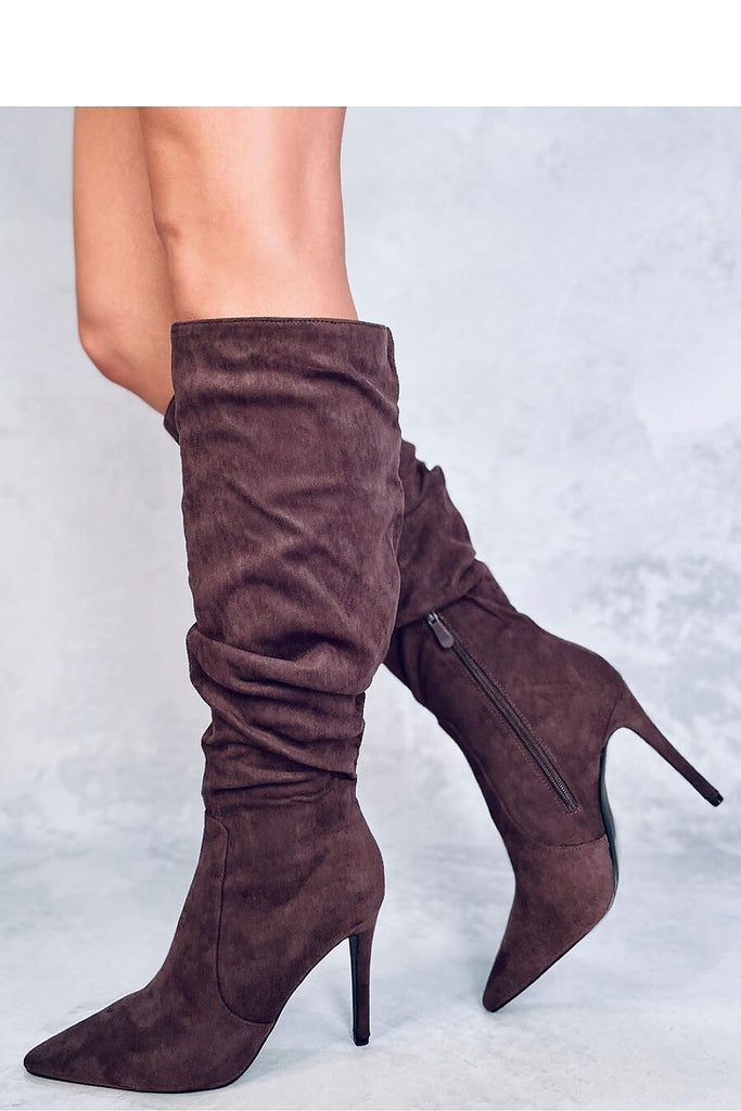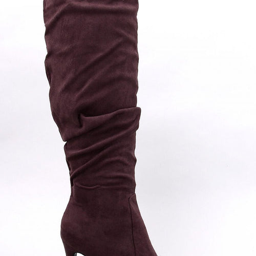 Women's suede boots on a stiletto heel with a height of 10,5 cm. They have a neat cut with tapered noses and a fashionably creased upper. They look beautiful on the leg - sure to captivate lovers of classic cuts.... Practical zipper closure is their additional advantage. They are made of eco-suede, on a foam lining. fabric ecological suede warmers...