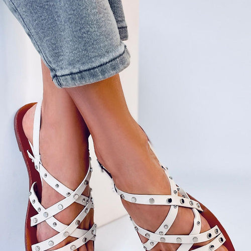 Women's veneer sandals - rompers on a flat sole. The model is distinguished by striking studs, which give the shoes character.... These are perfect shoes for summer - do not wait and order them now : ) Outer material ? ecological leather. fabric artificial leather Size Insole lenght 36 24 cm 37 24,5 cm 38 25 cm 39 26 cm...
