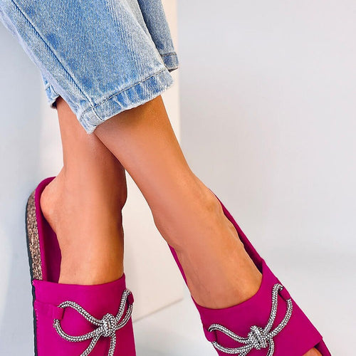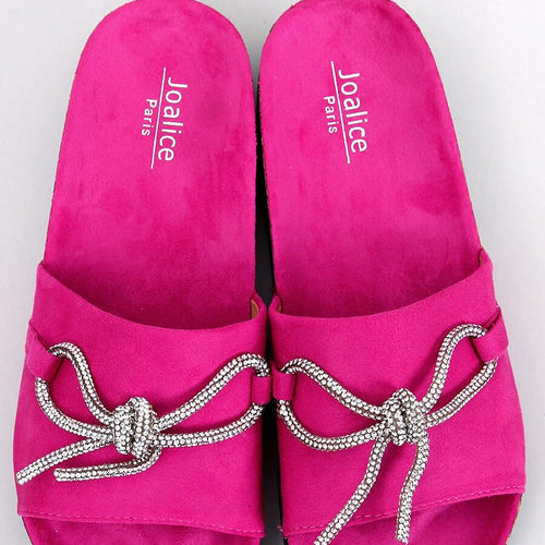 Women's flip-flops on a cork sole. The suede strap decorated with a bow of glittering stones gives the shoes a unique charm. We are confident that these flip-flops with profiled inner insole will meet your expectations : ) Outer material ? ecological suede. fabric ecological suede Footbed ecological suede Size Insole lenght 36 22,5 cm 37 23,5 cm 38 24...