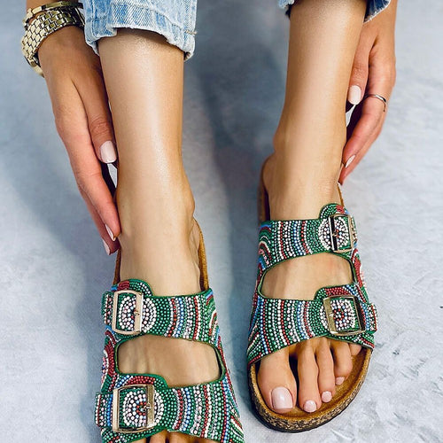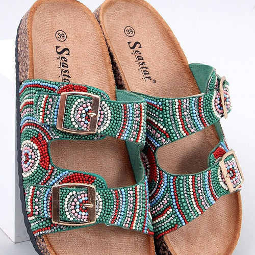 Women's flip-flops ? Scholars on a cork sole. The model is distinguished by multicolored beads combined with sparkling zircons.... The whole creates a holiday look! Perfectly profiled inner insole lined with fabric will ensure comfort in every step : ) Outer material ? ecological suede. fabric ecological suede Footbed fabric Size Insole lenght 36 23 cm 37 23,5 cm 38...