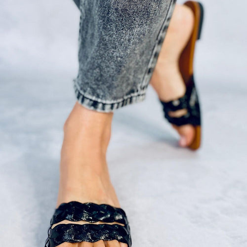 Women's flip-flops on a flat sole. If you want to look unique then this square cut model with braided straps is made for you : ) Flip-flops are perfect shoes for summer! External material ? ecological leather. fabric artificial leather Size Insole lenght 36 23,5 cm 37 24 cm 38 24,5 cm 39 25 cm 40 26 cm 41 26,5...
