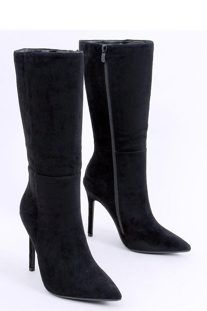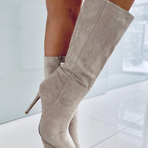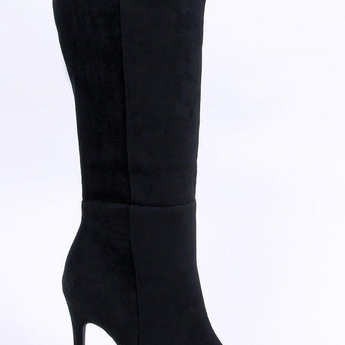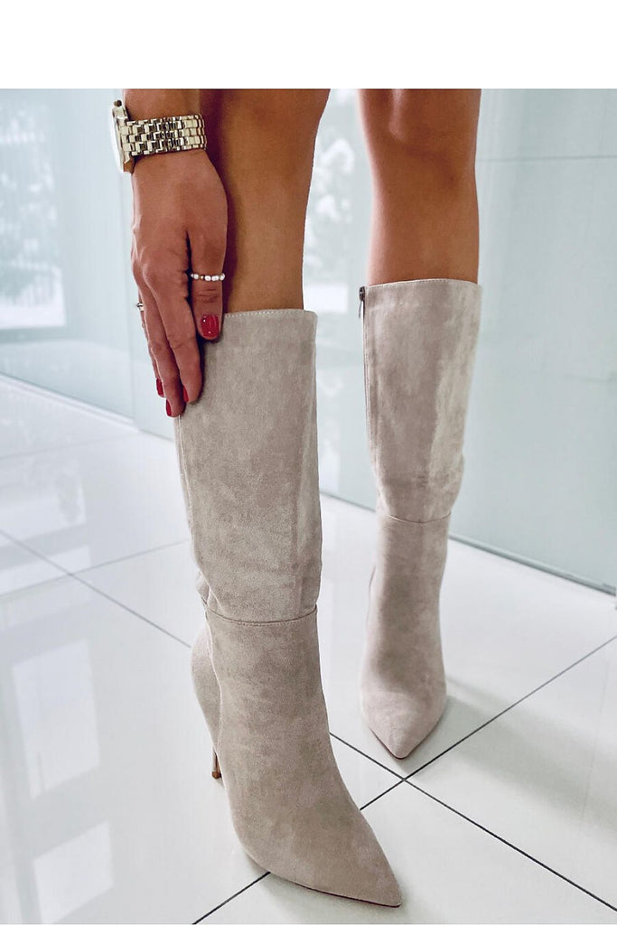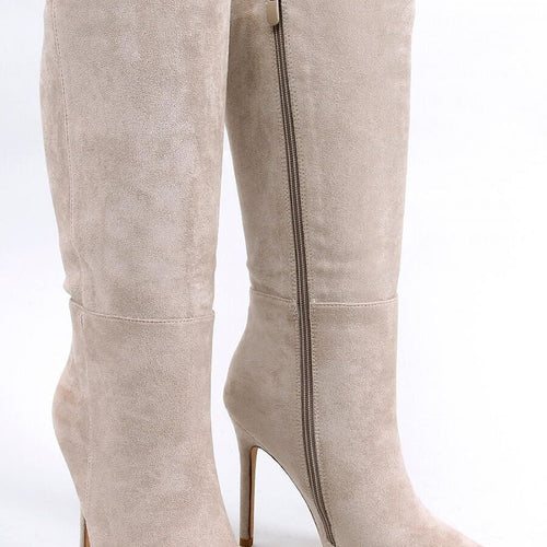 Women's suede heeled boots. Sleek, tapered noses are elegant, and the slender stiletto with a height of 11.5 cm is very feminine and beautifully elongates the silhouette. They are sure to captivate lovers of classic cuts.... Practical zipper closure is their additional advantage. They are made of organic suede, on a foam lining. fabric ecological suede warmers foam padding Heel...