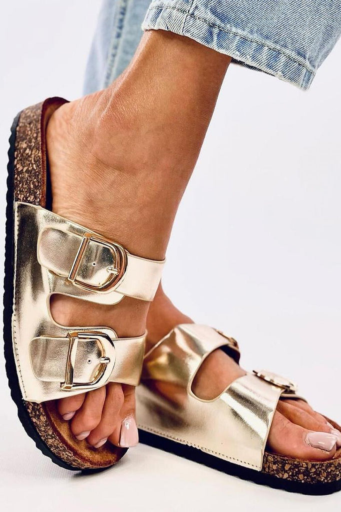 Women's sandals with a cork sole. Adjustable buckles ensure a perfect fit to the foot, and the contoured insole guarantees comfort with every step - see for yourself! These are perfect shoes for the summer :) Outer material - eco-suede/eco-leather (gold color) fabric artificial leather Size Insole lenght 36 23 cm 37 23,5 cm 38 24 cm 39 25 cm...