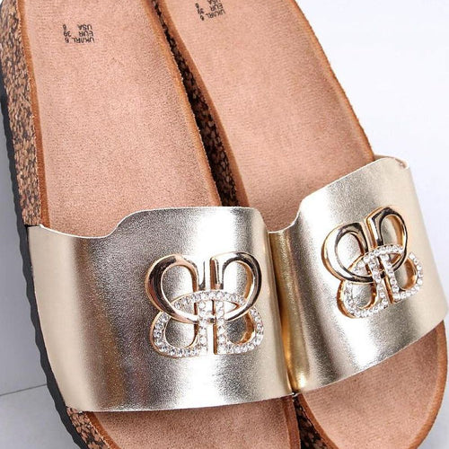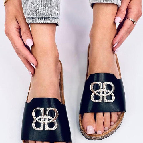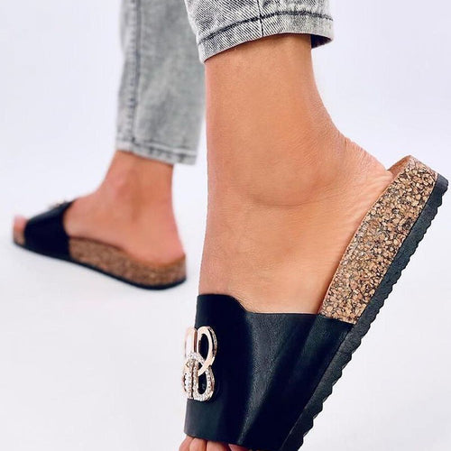 Women's leatherette slides on a cork sole. They feature a wide strap with a stylish embellishment and rhinestones that will surely catch your eye :) These incredibly comfortable slides with a contoured footbed are a must-have in every wardrobe! Outer material - faux leather. fabric artificial leather Size Insole lenght 36 23 cm 37 23,7 cm 38 24,5 cm 39...