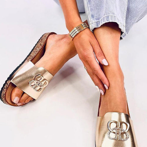 Women's patent slides on a cork sole. They feature a wide strap with a stylish decoration and rhinestones that are sure to catch your eye :) These incredibly comfortable slides with a contoured insole are a must-have in every wardrobe! Outer material - eco leather. fabric artificial leather Size Insole lenght 36 23 cm 37 23,7 cm 38 24,5 cm...