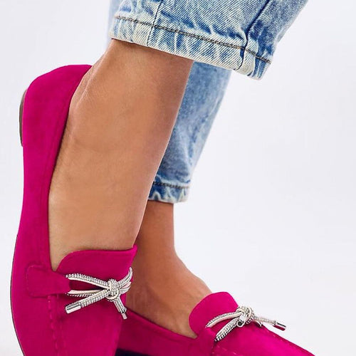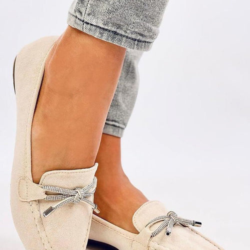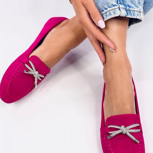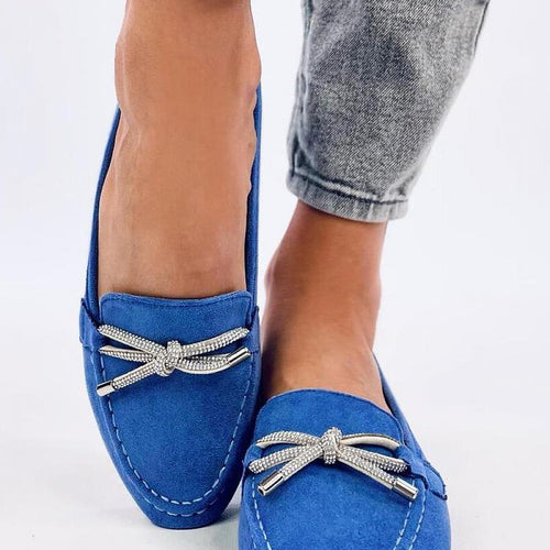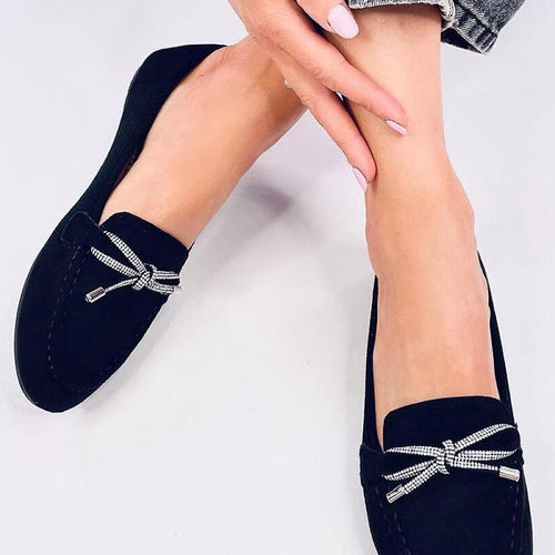 Women's suede loafers. The model features a classic and sleek design with a beautiful bow adorned with sparkling rhinestones. An additional advantage is the comfortable inner insole with a cushion. Enjoy comfortable and stylish footwear every day :) Outer material: eco-suede. fabric ecological suede Size Insole lenght 36 23 cm 37 23,5 cm 38 24 cm 39 25 cm 40...