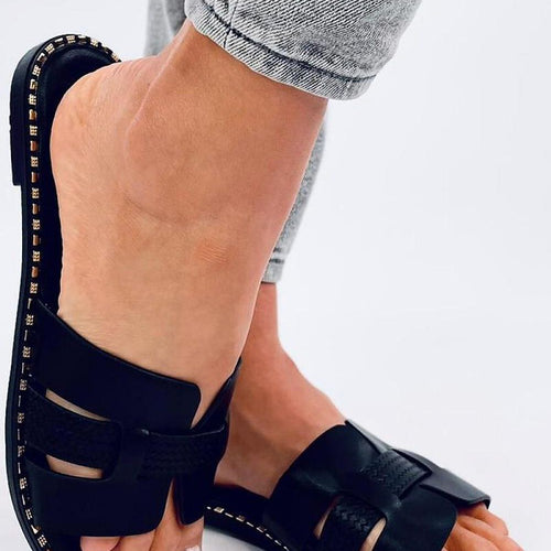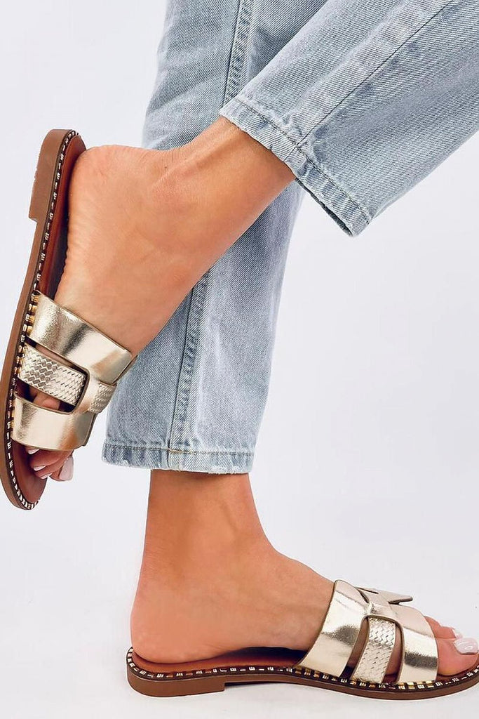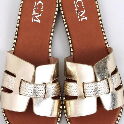 Elegant women's flip-flops on a flat sole. The model is distinguished by a stylish design with decorative trim in gold finish.... In these shoes you will certainly feel fashionable, feminine and extremely comfortable.... They will certainly meet your expectations : ) Outer material ? ecological leather. fabric artificial leather Size Insole lenght 36 23 cm 37 24 cm 38 24,5...