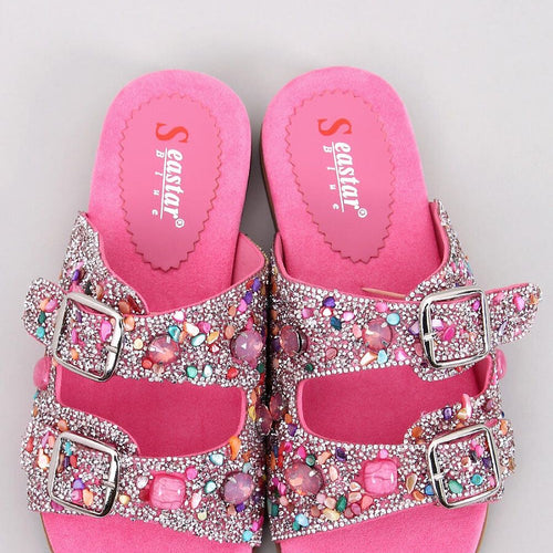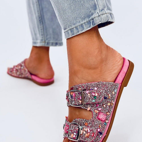 Women's suede flip-flops. This unique model embellished with sparkling stones and zircons will attract all eyes! You will feel fashionable in them, but also comfortable - they have a soft inner insole. Check it out for yourself! Outer material ? ecological suede. fabric ecological suede Size Insole lenght 36 23,5 cm 37 24,2 cm 38 24,8 cm 39 25,5 cm...