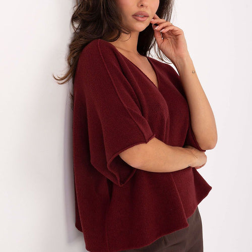 Casual women's sweater of standard length, perfect for everyday wear. Made of a pleasant to the touch blend of viscose, polyester, and nylon, it ensures comfort and durability for a long time. The smooth pattern makes the sweater versatile and easy to pair with various wardrobe items. The model with short sleeves and a V-neck combines comfort and feminine lightness....