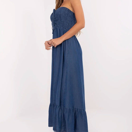 Summer maxi dress with a flared silhouette is the quintessence of feminine style and comfort for warm days. Made of lightweight, breathable lyocell, it will be perfect for everyday stylizations, providing comfort and breathability. The sleeveless model with a rectangular neckline looks subtly and modernly. The top part of the dress is adorned with an impressive gathering with elastic bands,...