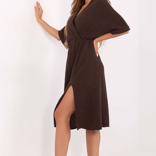 A summer dress made of breathable muslin is a must-have in everyday wardrobe. Made of 100% cotton, it provides exceptional comfort and breathability even on hot days. The flared cut with a wrap front beautifully accentuates the silhouette, and the elastic waistband ensures a perfect fit without the need for fastening. Smooth fabric, midi length, and short sleeves make the...