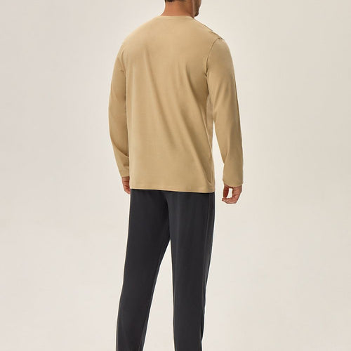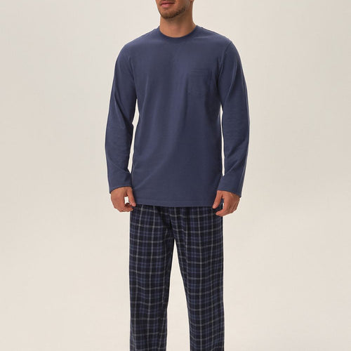 A men's pajama consisting of a long-sleeved shirt and long pants is a combination of style and comfort. The shirt has a round neckline and a pocket at chest height, adding practicality and elegance. The loose fit provides comfort, while the soft and breathable fabric ensures comfort throughout the night. The pants, decorated with a classic check print, are equipped...