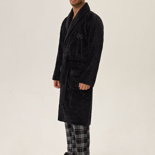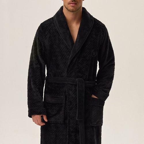 Men's Huge bathrobe is an elegant proposition that will delight lovers of comfortable homewear clothing. The black Huge bathrobe has a classic, loose cut, and thanks to the tie at the waist, you can adjust it to your needs. The delicate embossed pattern and small emblem placed at the height of the left chest add an elegant touch. Dimensions: Size...