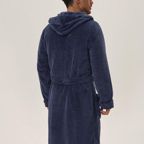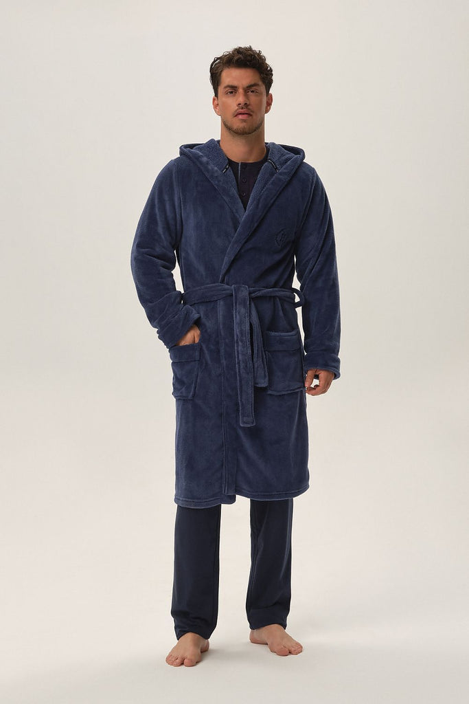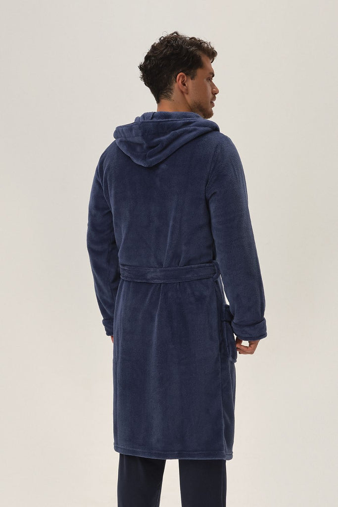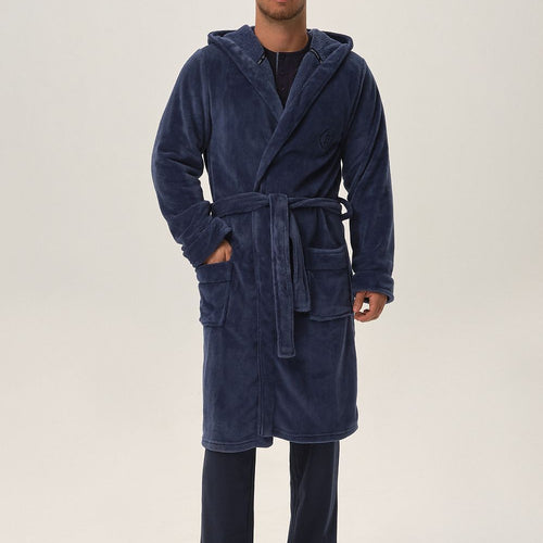 The Hover model is a dark blue knee-length men's robe. It is soft, comfortable to wear and will keep you warm after a bath. It is also perfect for holiday trips. It has a practical, spacious hood, two pockets at hip height and an elegant emblem on the left chest. Thanks to the waist tie, you can adjust it to...