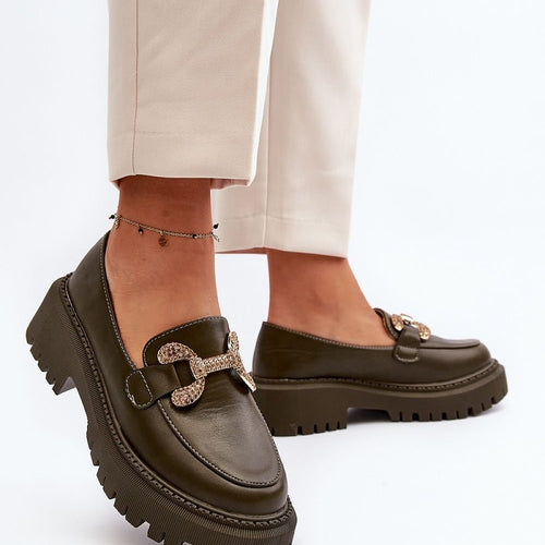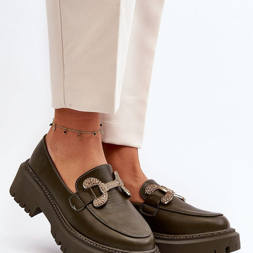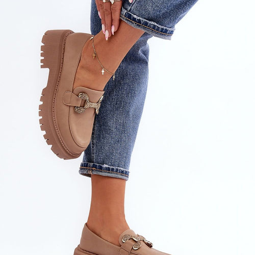 Women's moccasins made of eco leather. Set on a massive flat heel and a thick sole. This model has a rounded nose and a gold ornament on the front. You should definitely have them in your closet! fabric artificial leather Footbed artificial leather Upper height 4.5 cm Heel height 5 cm Platform height 3.5 cm Size Insole lenght 36 23...
