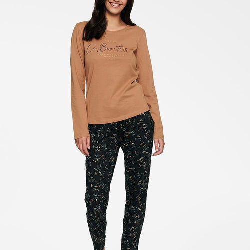Three-piece 100% cotton pajamas in a stylish, muted color scheme. The blouse in caramel color has long sleeves, a round neckline and a delicate printed inscription on the chest. The bottom is two trouser options to choose from: short shorts or long pants with a tapered leg. The dark pajama bottoms are entirely covered with a print of tiny twigs....