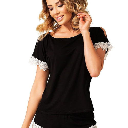 Comfortable, two-piece pyjamas made of breathable viscose. The top is a chemise with wide straps. The neckline is decorated with lace which goes all the way down the front of the top. The set includes short shorts decorated with the same lace on the sides. Comfortable proposal for sleeping, in which you can also have a lazy, weekend breakfast. Underwear...