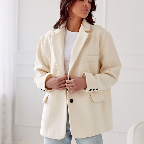 Cut in a voluminous cut with a slightly lowered shoulder line for an impeccable look. The jacket has long sleeves and three buttons located on the side of the cuff. In the front there are lapels transitioning into a collar which is a decorative element. It is fastened with buttons. On the sides it has imitation pockets. The model has...
