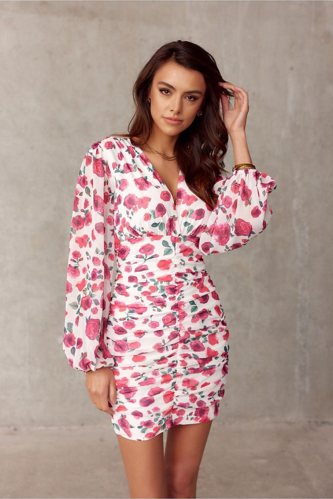 The top of the dress is an overlapping V neckline, which also gently accentuates the back. The long, buffeted sleeves, which give the whole look classy and chic, are finished with an elastic band. The cut-off under the bust emphasizes and slims the waist, and the placed draping enhances the shape of the silhouette. The lower part of the dress...