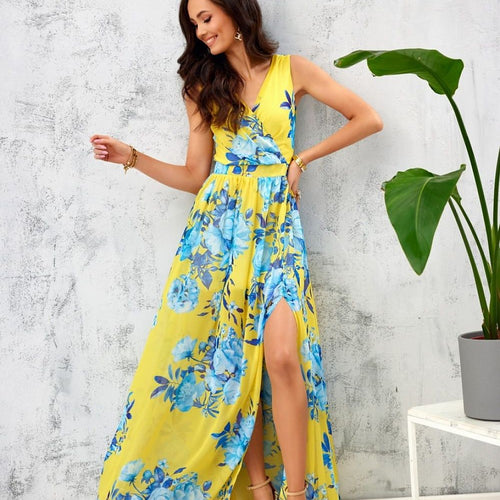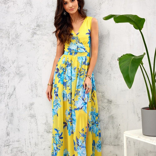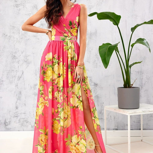 The floral chiffon maxi dress is made of very good quality chiffon, which is ethereal and airy, so it will be comfortable to wear. The maxi dress features a beautiful envelope neckline, which will optically elongate our figure. In addition, the evening dress has a leg slit and decorative binding on the back. It is fastened with a covered zipper...