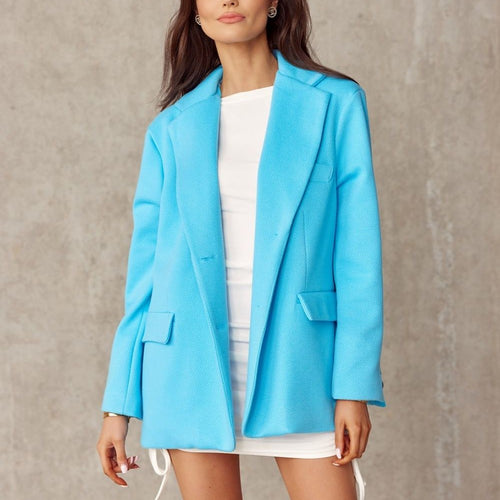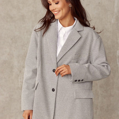 Cut in a voluminous cut with a slightly lowered shoulder line for an impeccable look. The jacket has long sleeves and three buttons located on the side of the cuff. In the front there are lapels transitioning into a collar which is a decorative element. It is fastened with buttons. On the sides it has imitation pockets. The model has...