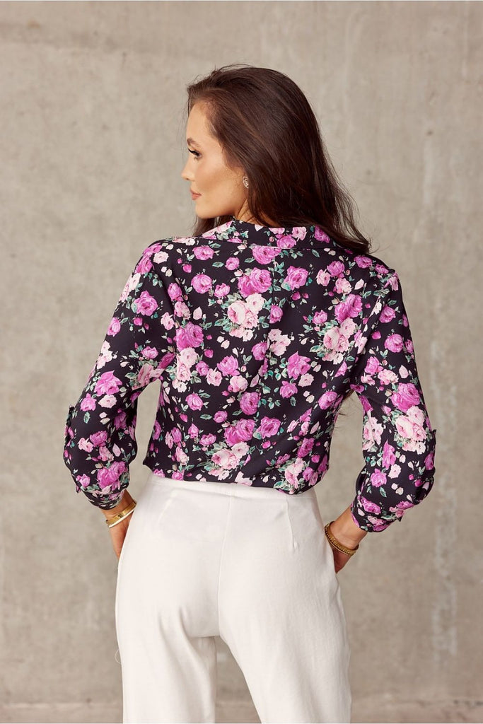 The classic cut shirt with a collar has rolled up 3/4 buttoned sleeves finished with cuffs. The shirt has a V neckline, which skillfully exposes its area and makes you feel feminine while maintaining class. It is fastened at the front with small buttons. A perfect base for many outfits, for your fitted jeans, pants with flared legs or an...
